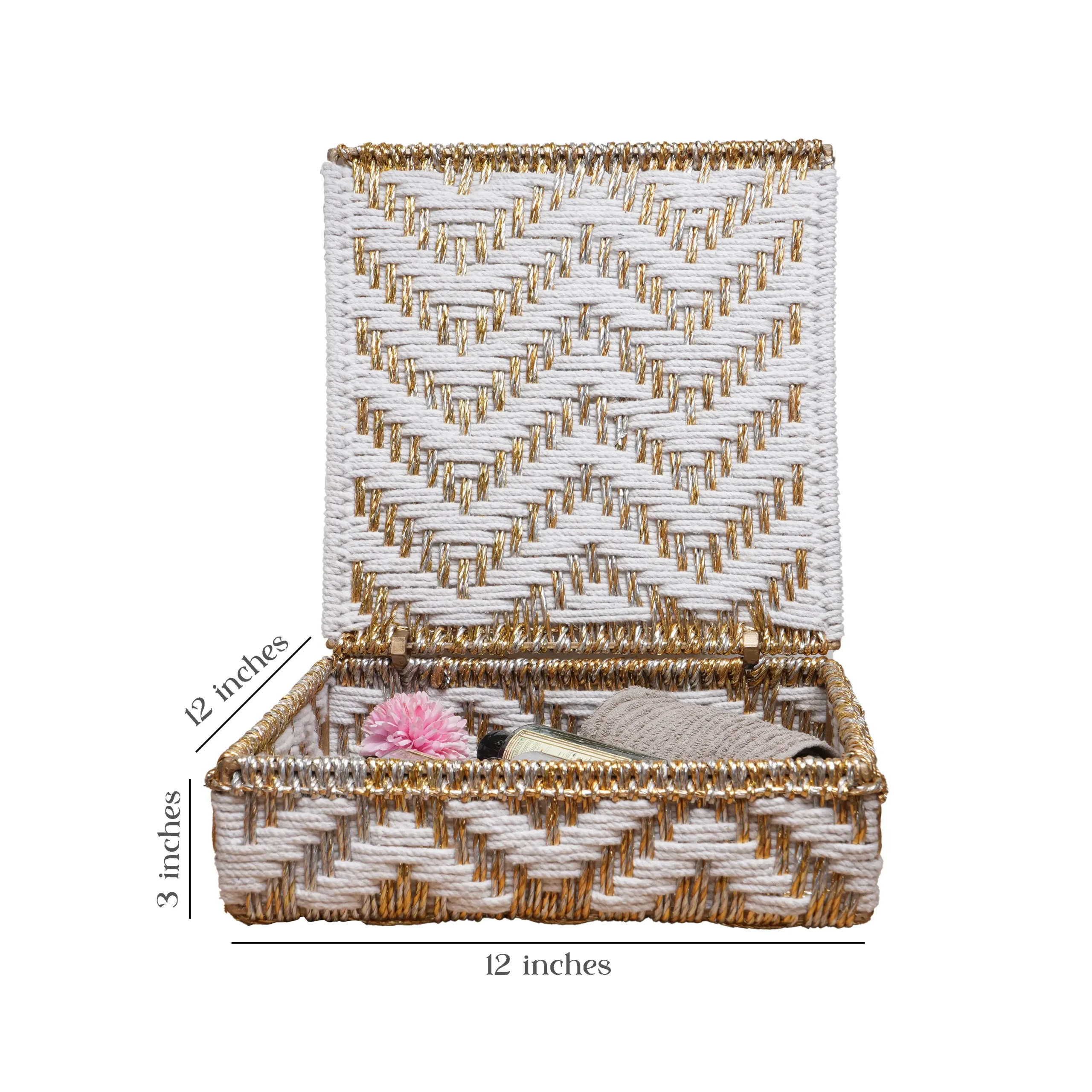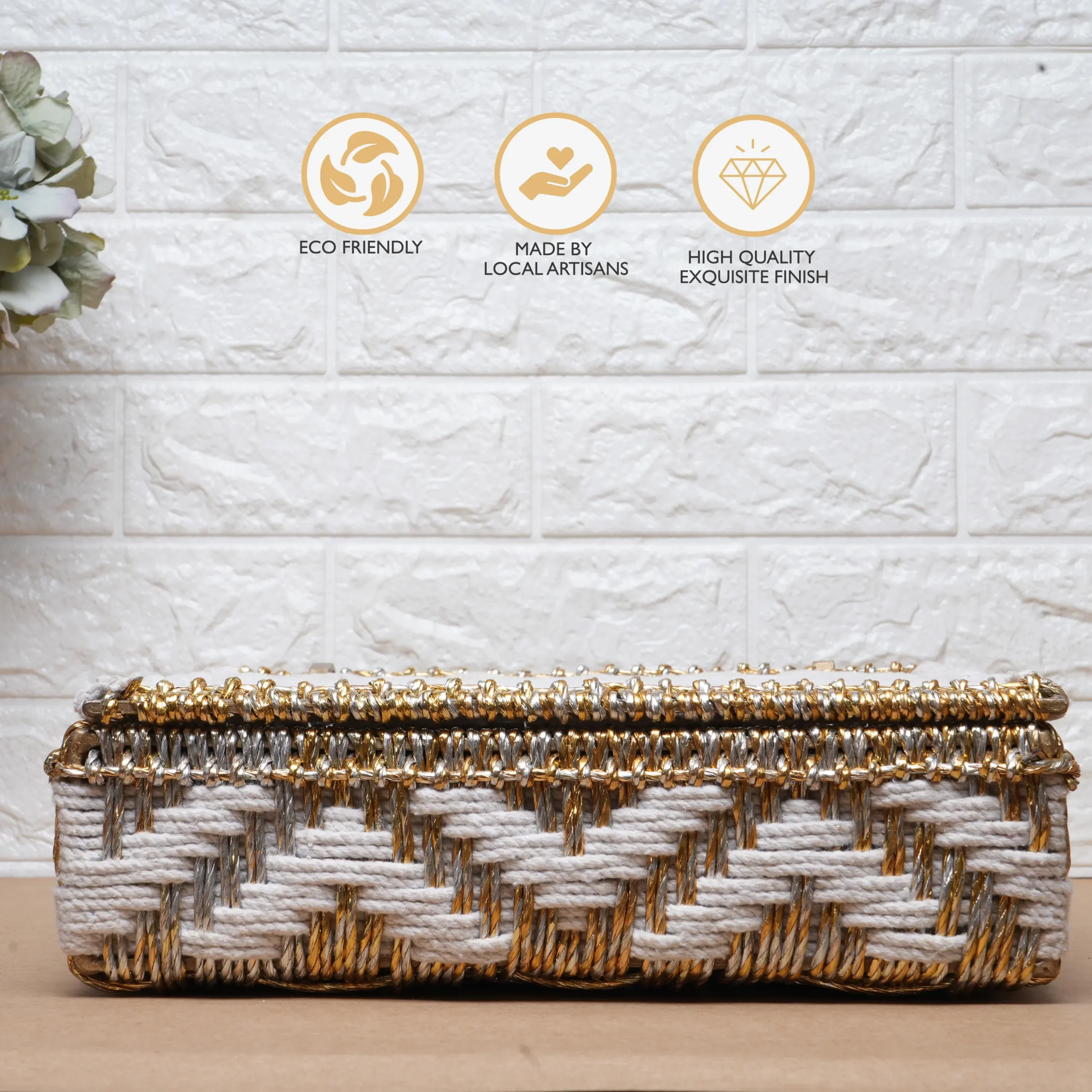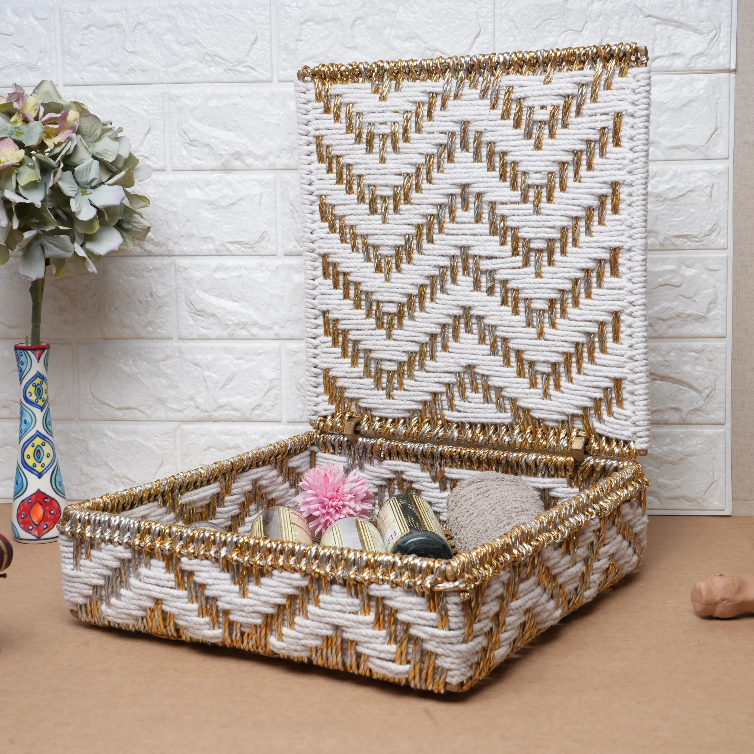 A beautifully handwoven white and golden chevron storage box crafted with cotton and upcycled plastic ropes. Designed for elegant organization, it’s perfect for jewelry, accessories, or keepsakes, adding artisanal sophistication to any home. Curated by Shivom Bliss to celebrate sustainable artistry and conscious living.