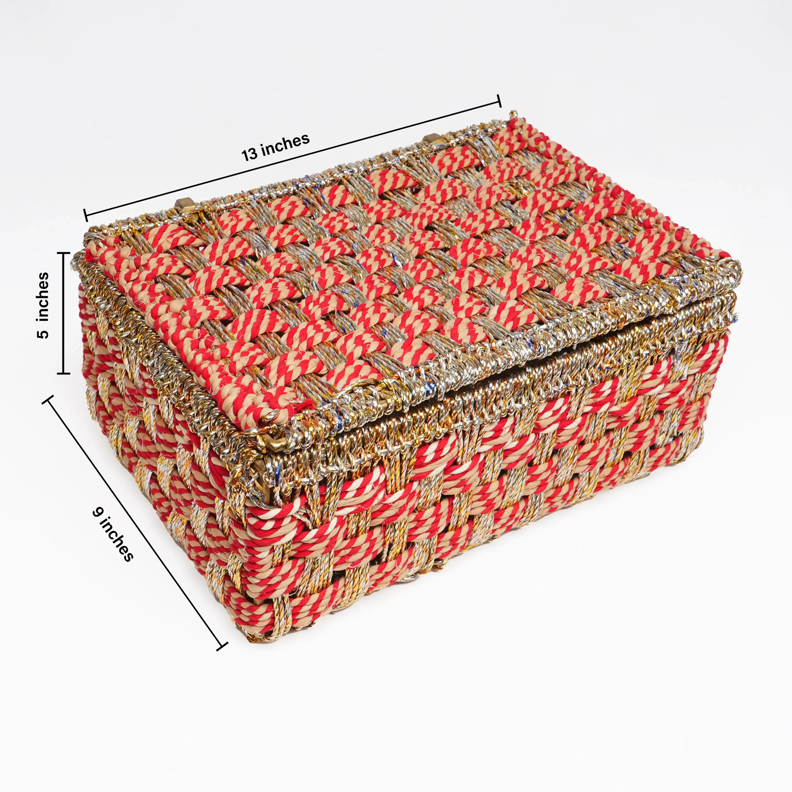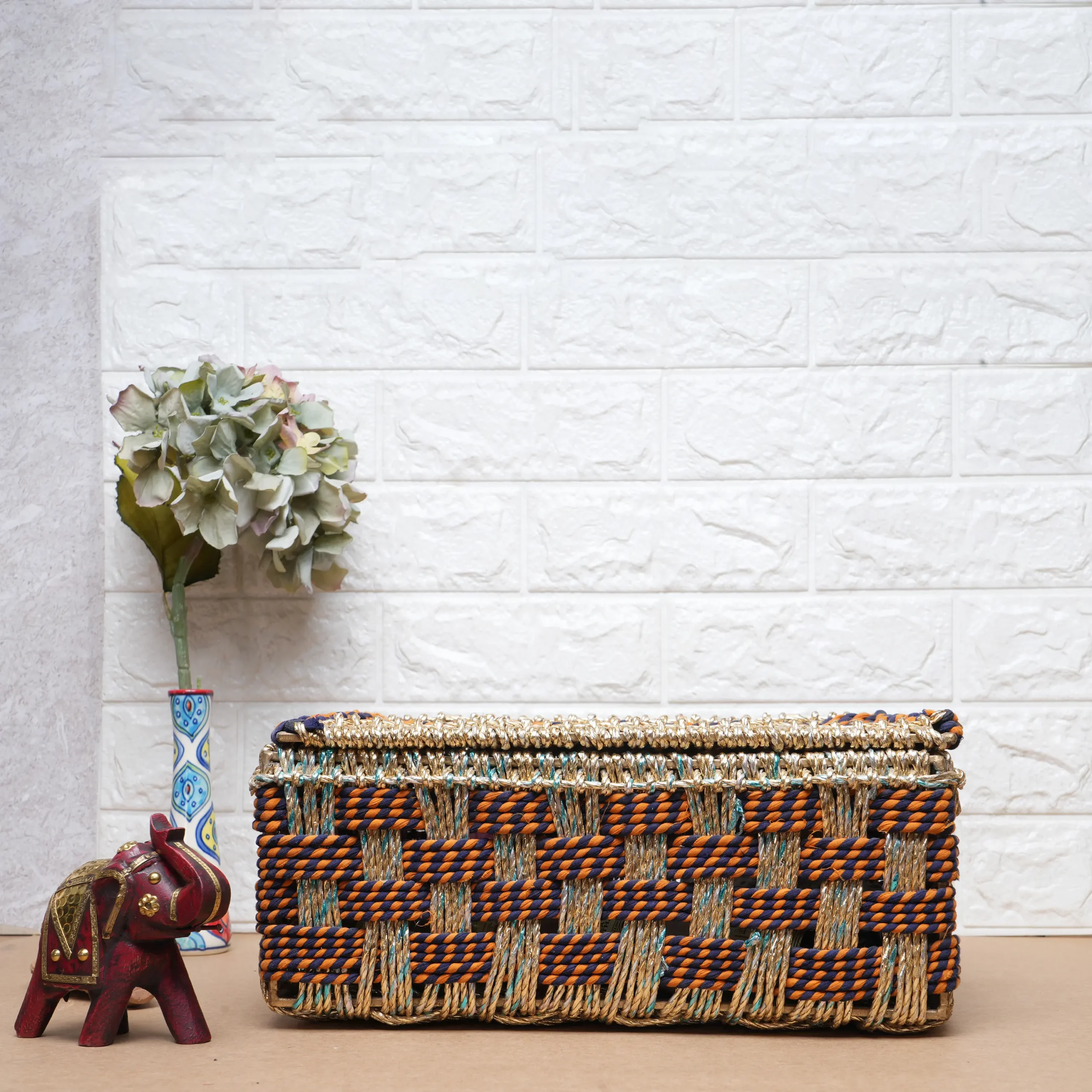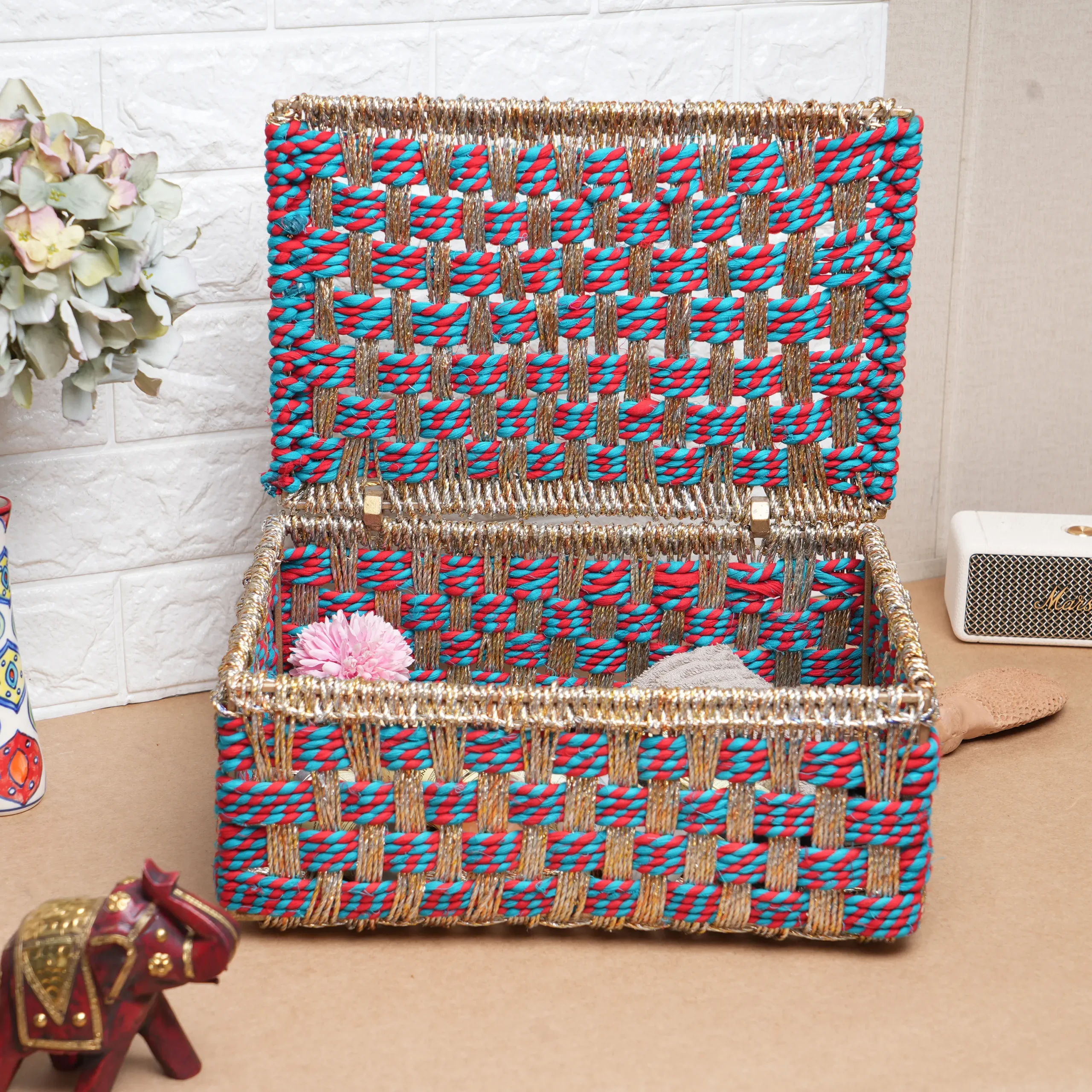 A beautifully rectangular handwoven storage box crafted with colorful chindi threads and accented by metallic golden rope on a sturdy iron frame. Each box features a secure hinged lid and is available in three unique color variants, Blue & Orange, Red Beige Golden, and Red & Blue, so you can choose the perfect fit for your home décor or gifting needs. Curated by Shivom Bliss to honor India’s handmade legacy and eco-conscious craftsmanship.