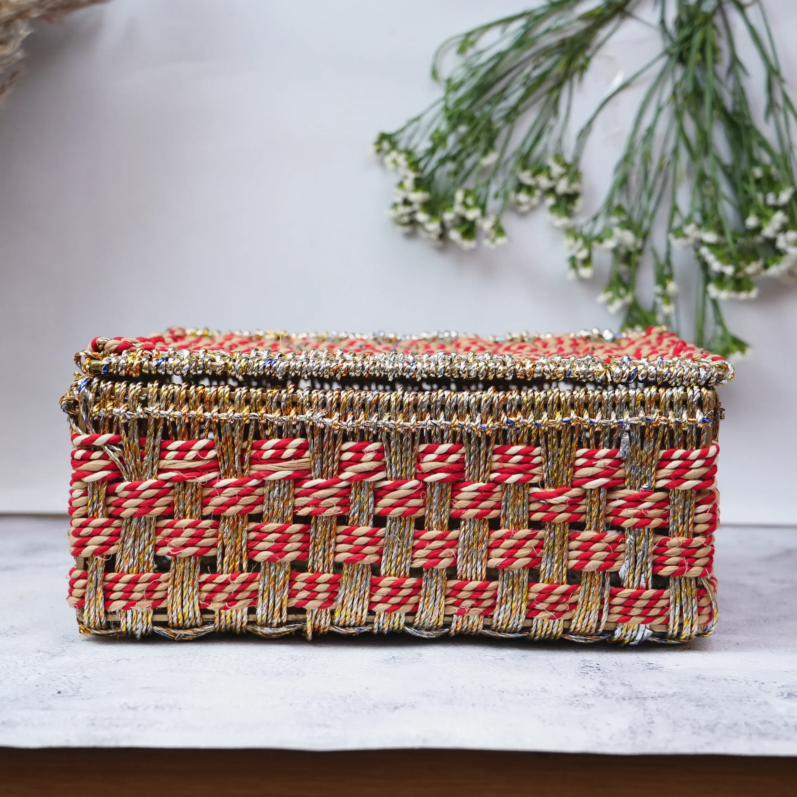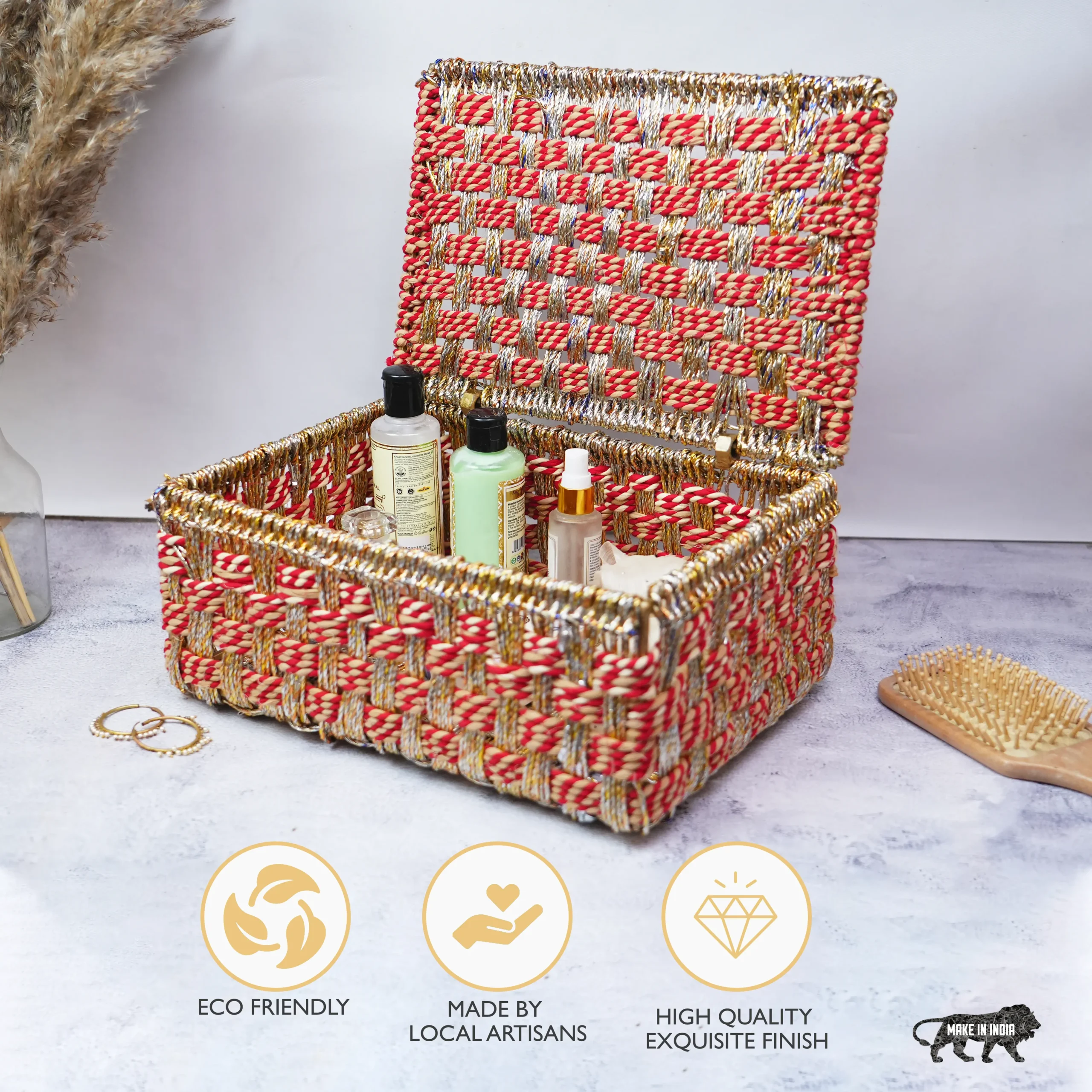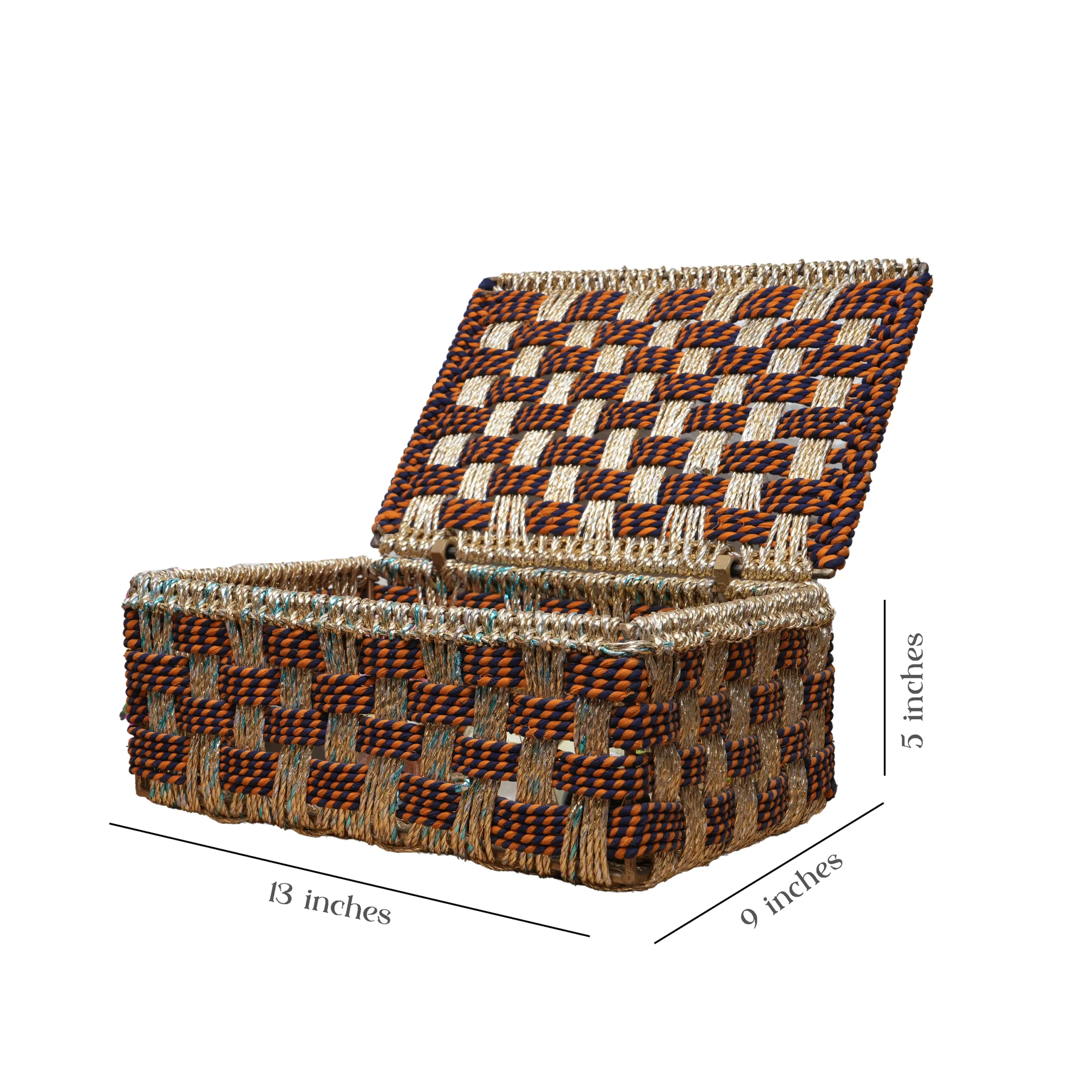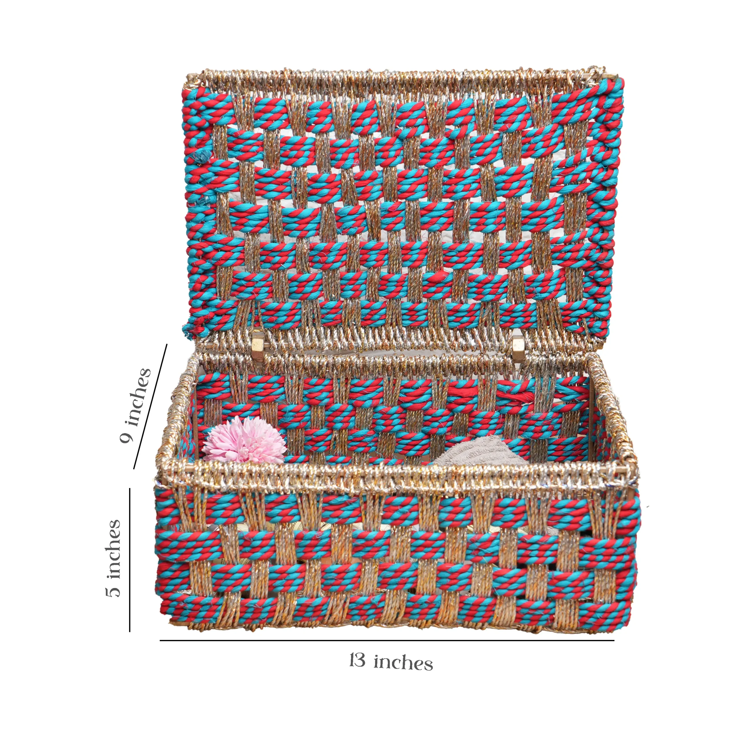 A beautifully rectangular handwoven storage box crafted with colorful chindi threads and accented by metallic golden rope on a sturdy iron frame. Each box features a secure hinged lid and is available in three unique color variants, Blue & Orange, Red Beige Golden, and Red & Blue, so you can choose the perfect fit for your home décor or gifting needs. Curated by Shivom Bliss to honor India’s handmade legacy and eco-conscious craftsmanship.