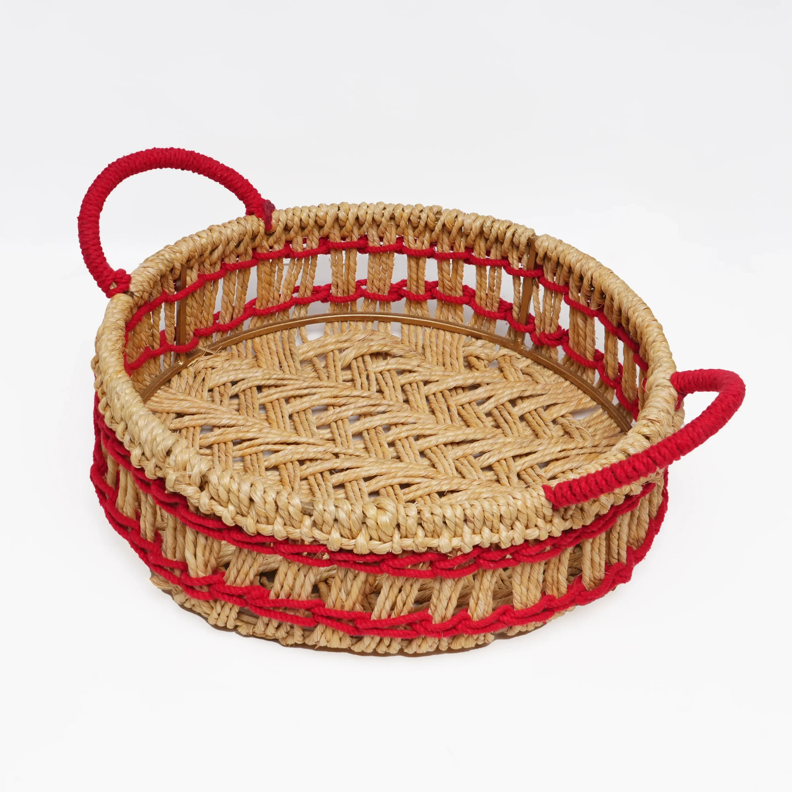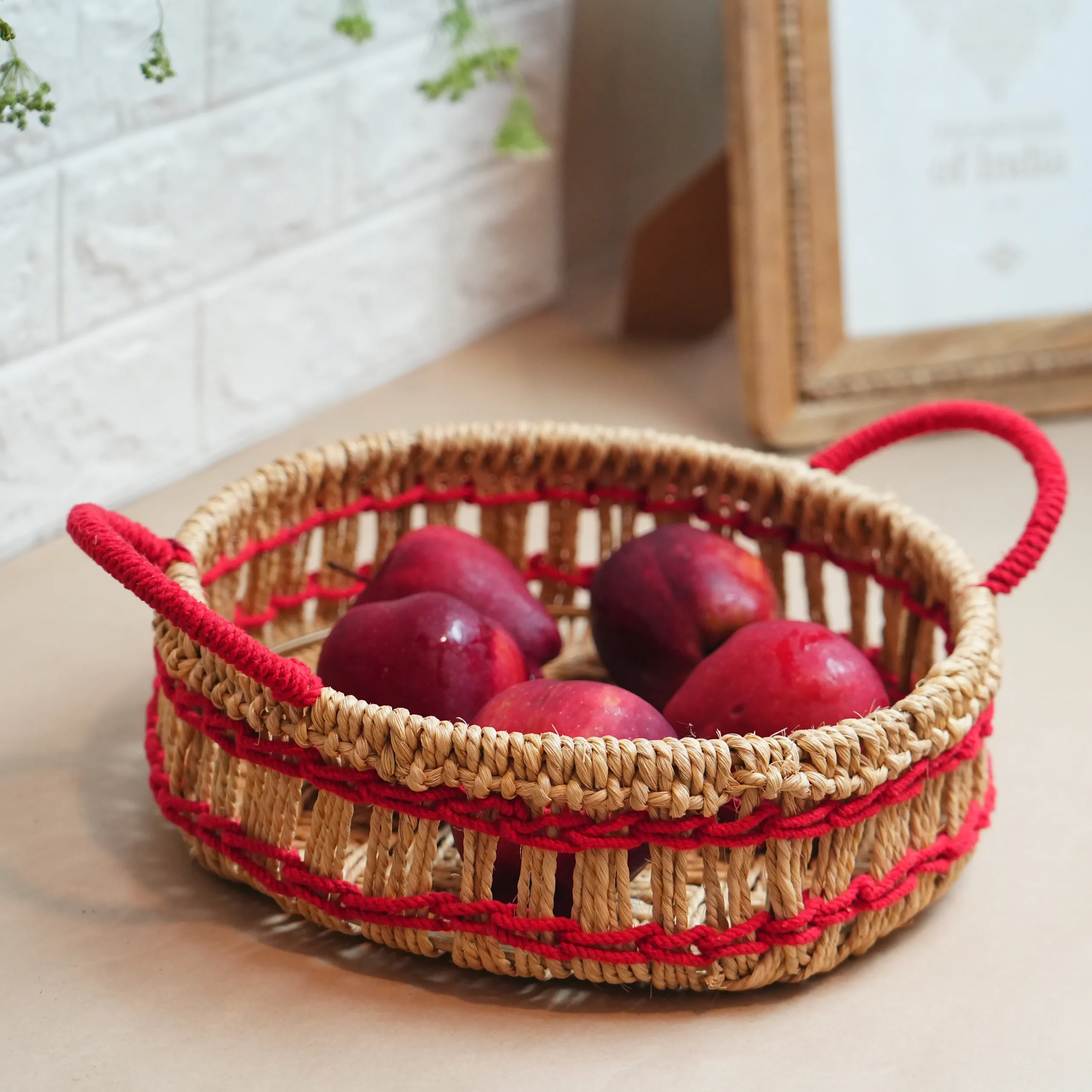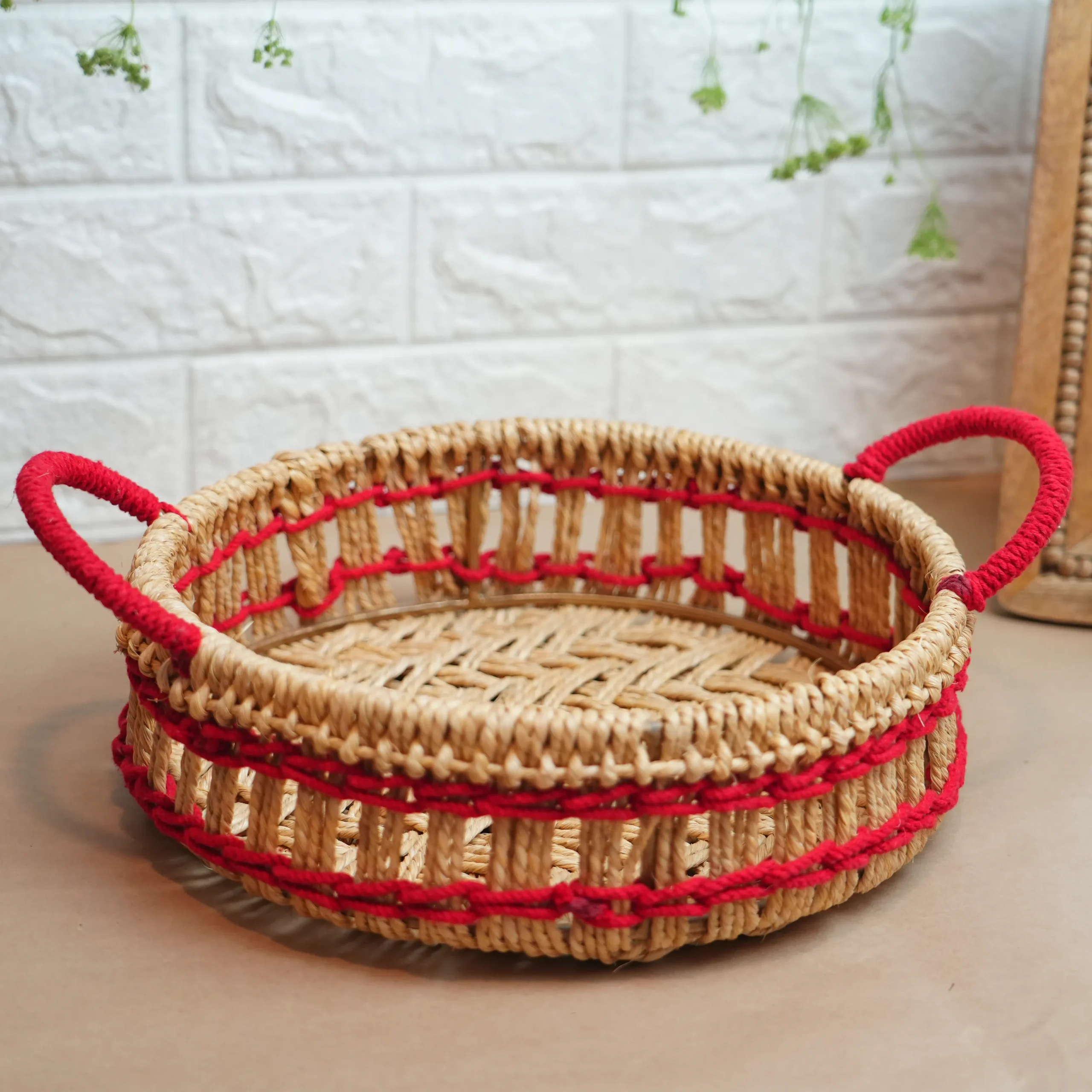 A round handwoven basket made with cotton and muni ropes on a sturdy iron frame. Designed with vibrant red handles, it brings artisan warmth and sustainable charm to any space. Curated by Shivom Bliss to support rural women artisans in Ganganagar, Rajasthan.