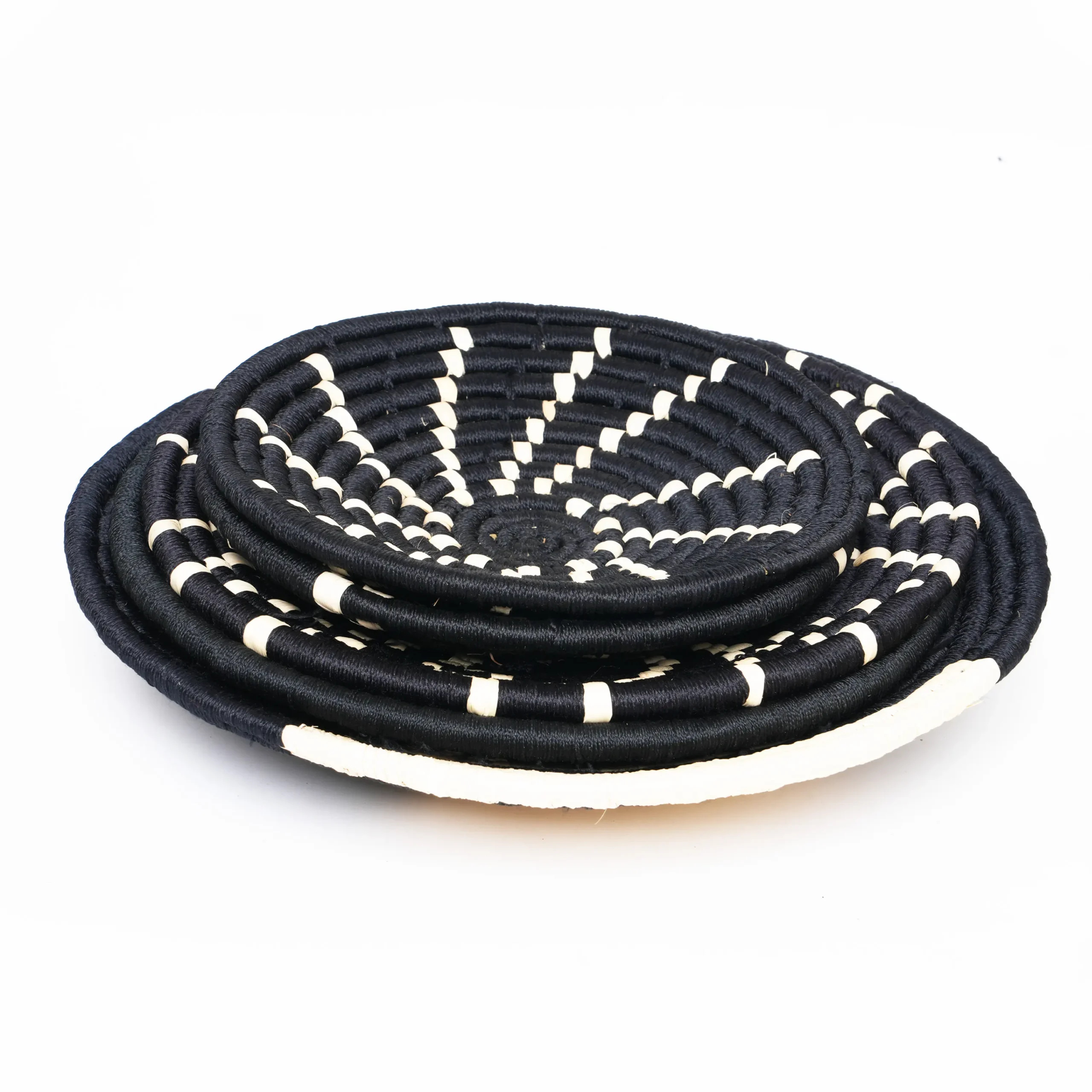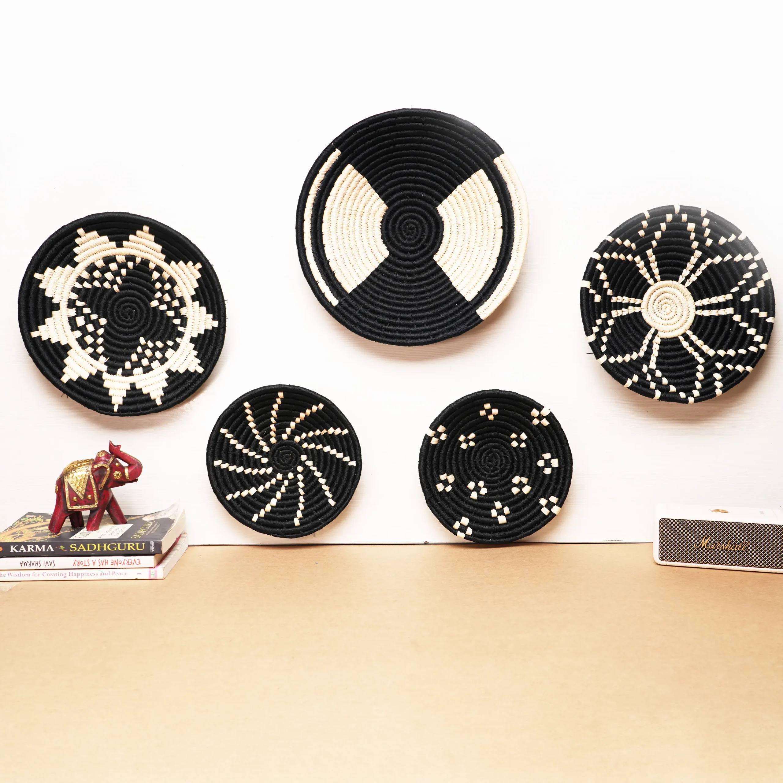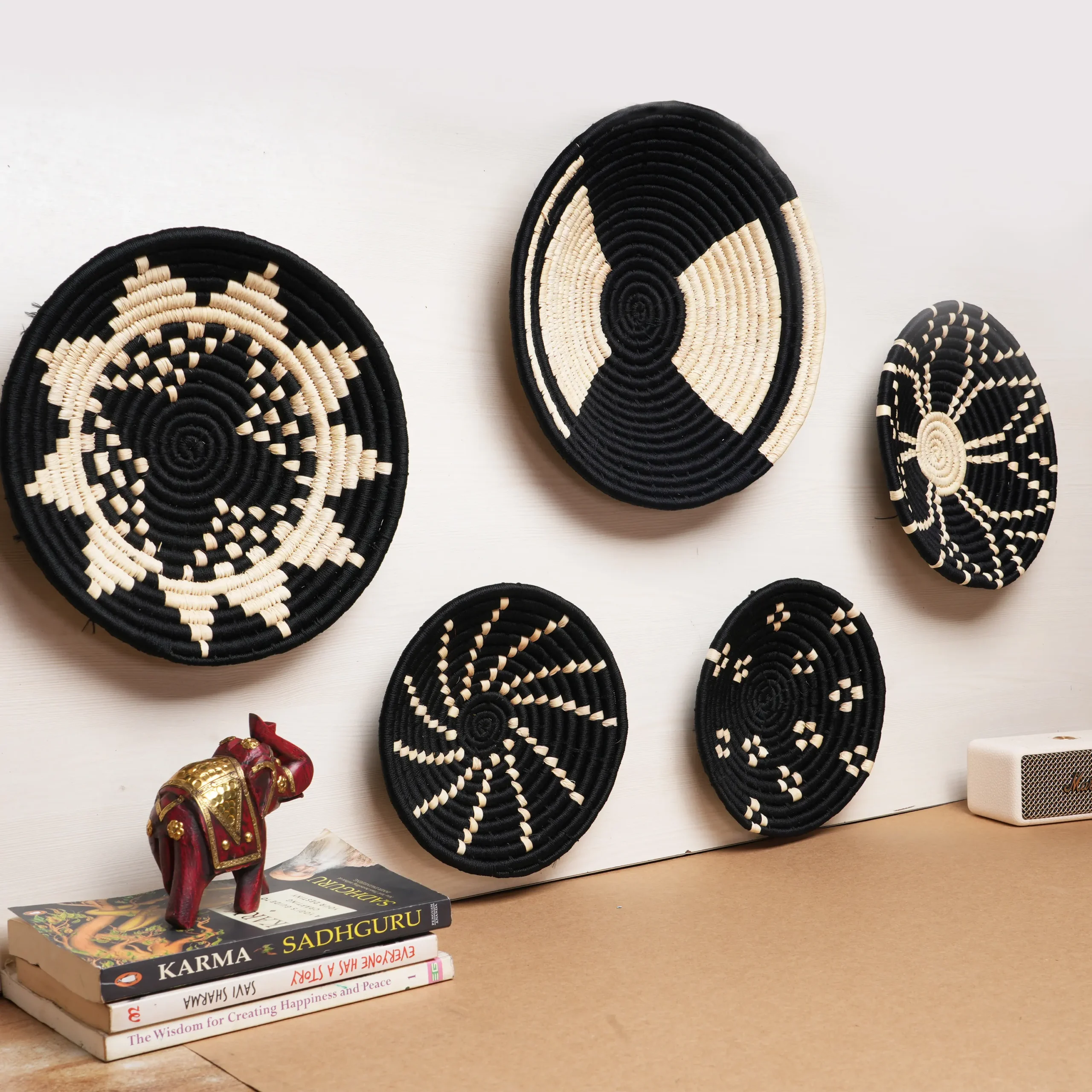Handwoven wall plate set of 5—black & natural Sabai grass. Modern, artisan-crafted, eco-friendly display for wall or table.
