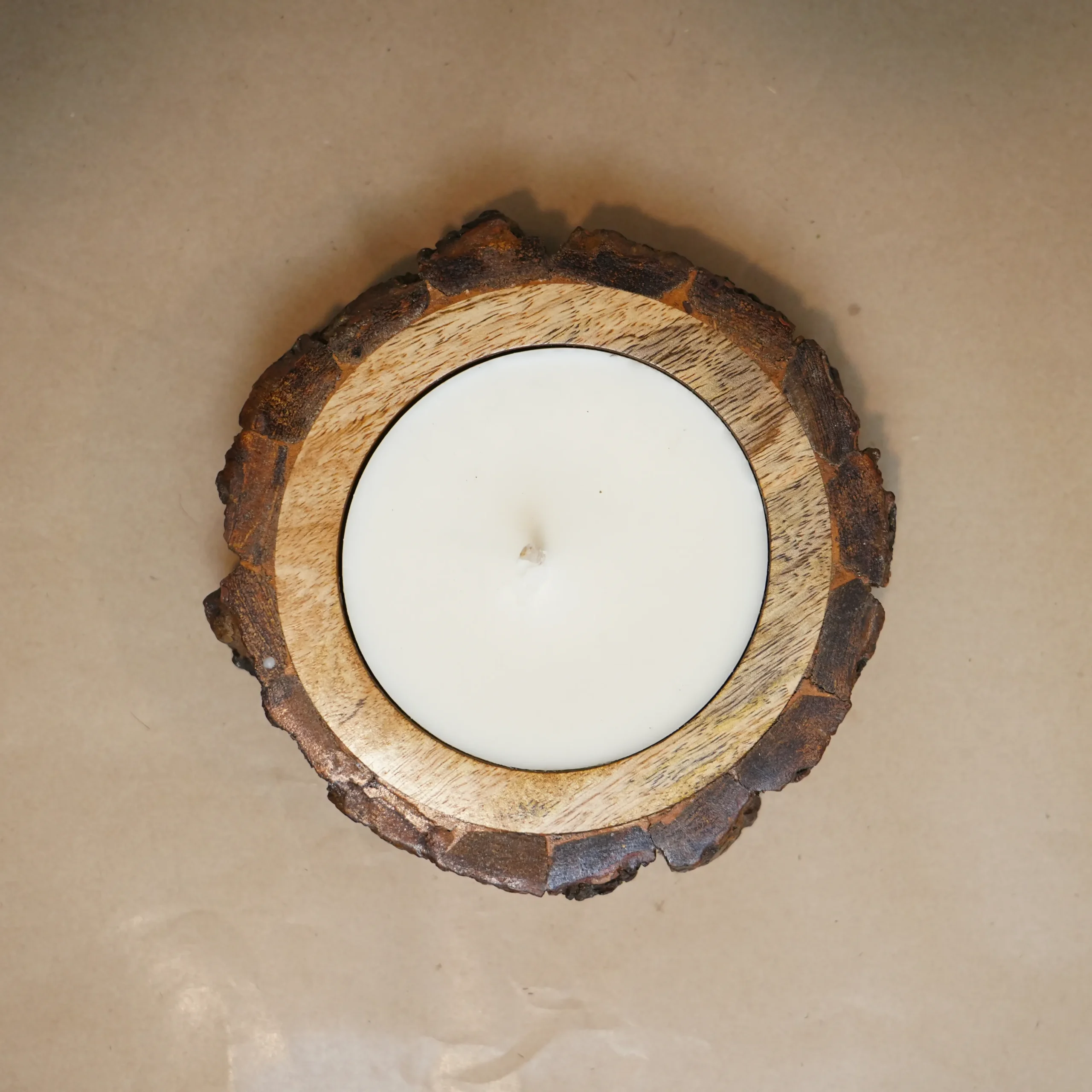 • Hand-poured soy-wax candle set in a natural wooden log base