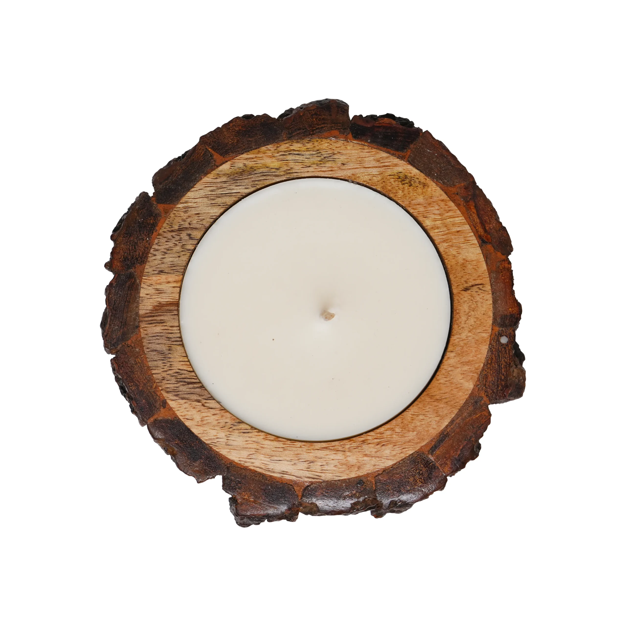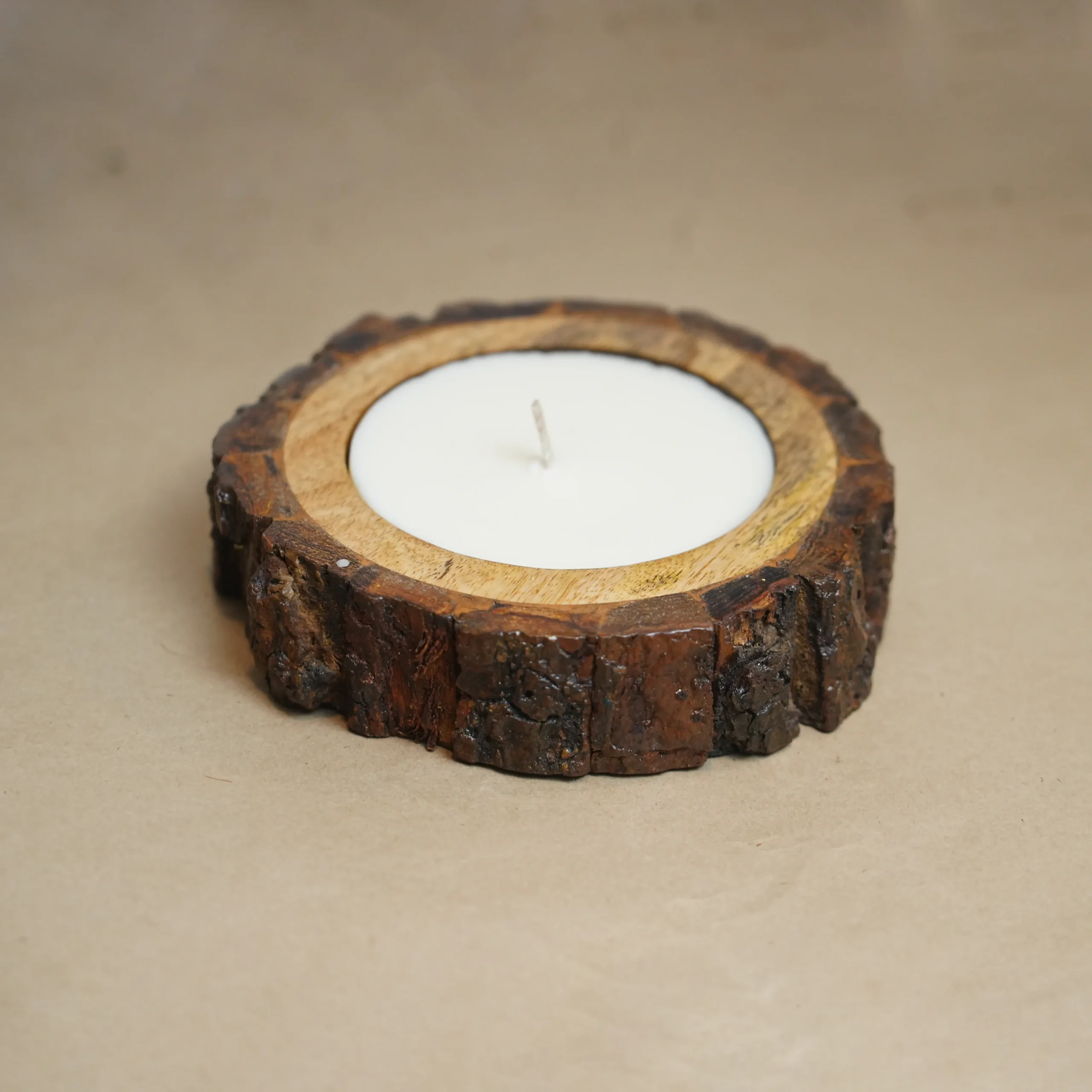 A rustic wooden log candle hand-poured with clean soy wax, designed to bring a cozy, natural touch to your décor. Each piece is uniquely shaped from real wood, celebrating organic textures and sustainable craftsmanship, perfect for earthy home styling or thoughtful gifting.